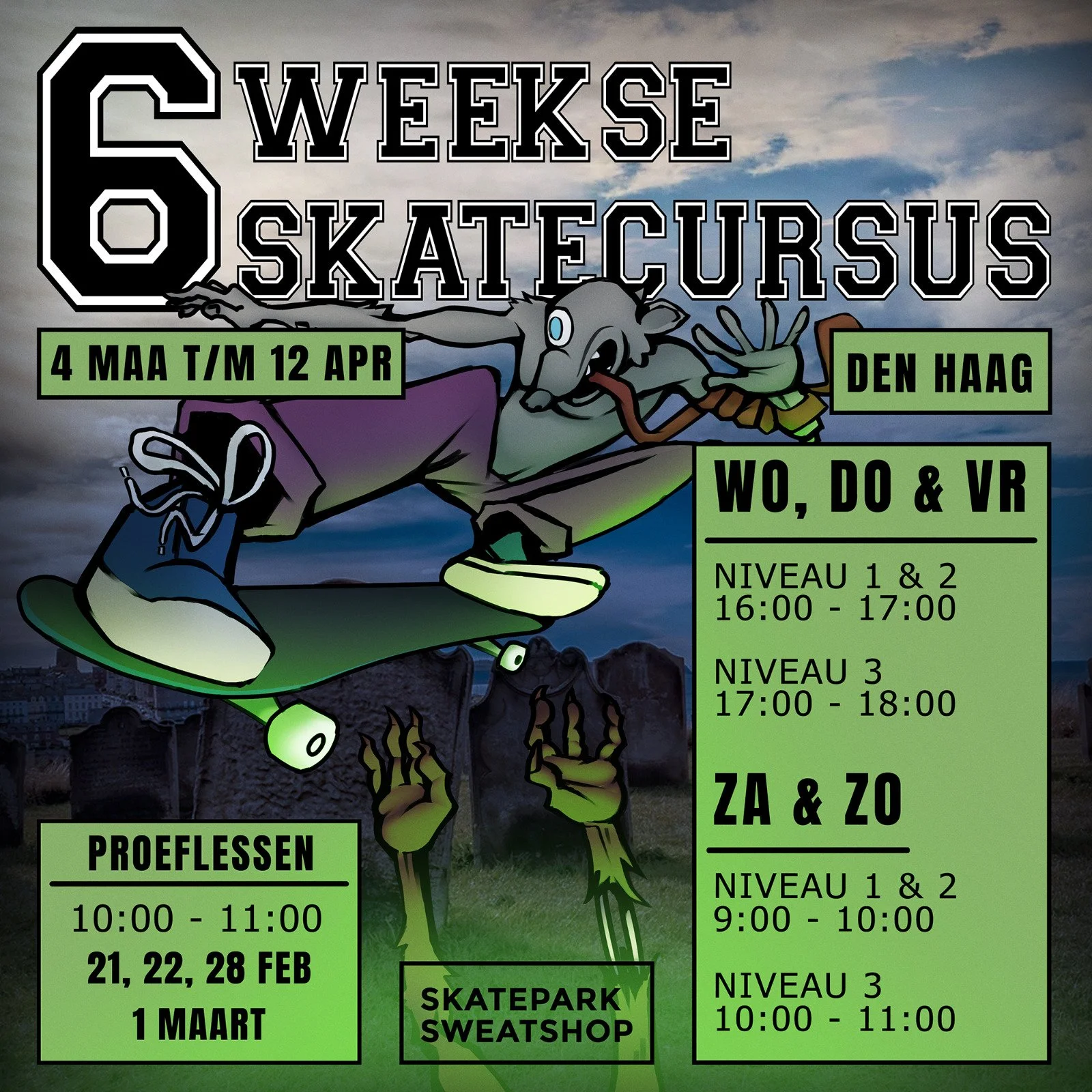 Wij hebben elke maandag van 18:00 tot 20:00 lessen voor skateboarders met passie voor het skateboarden!